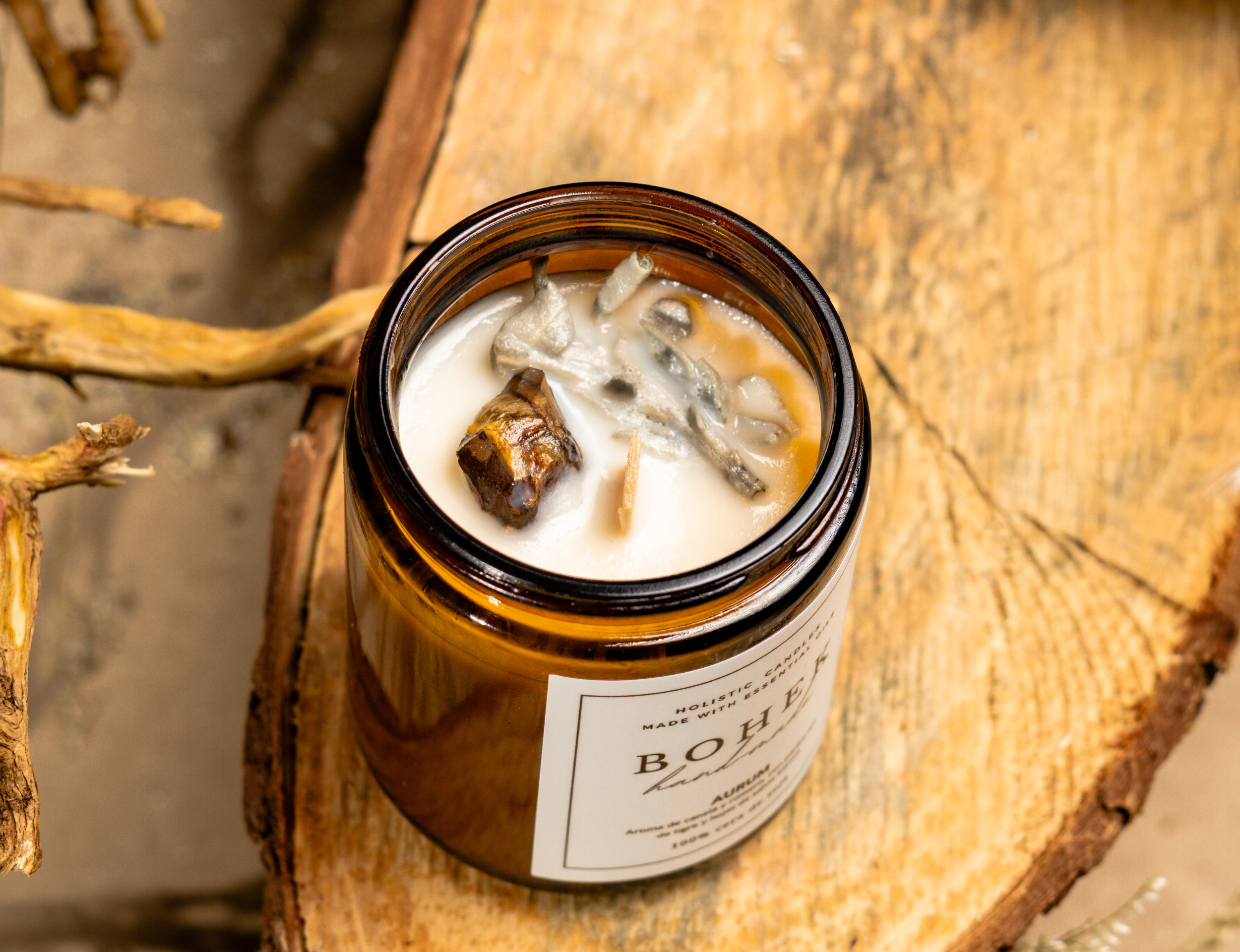 AURUM combina la calidez de la canela con la frescura del romero para crear un aroma equilibrado y rico. La piedra ojo de tigre fomenta la seguridad y la fuerza, mientras que las hojas de salvia blanca purifican y protegen el espacio. Perfecta para momentos de introspección y fortaleza personal.